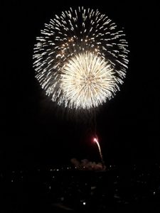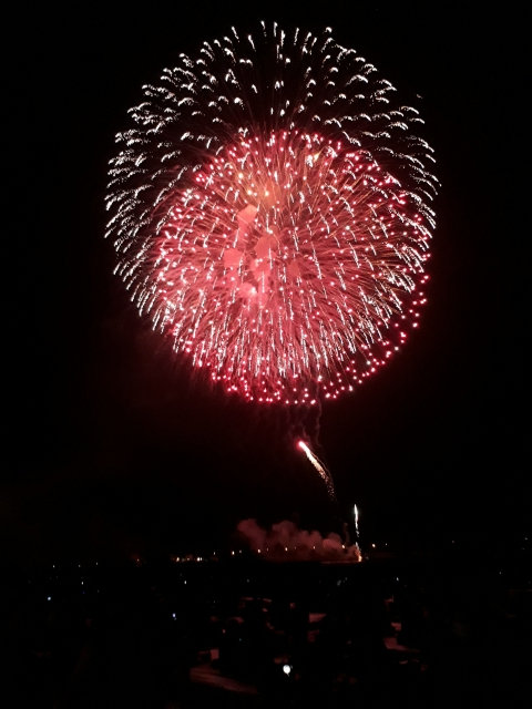 大花火大会は三条夏まつり協賛会会長の兼古商工会議所会頭の挨拶で始まり、協賛金が値上がりしたものの昨年と同じ33組のスターマインをはじめ、協賛金ベースで5640万円の花火が2時間にわたり華やかに夜空を飾りました。適度な風が北から南へ吹いて煙がすぐに流れるため観覧会場からは一層綺麗に見えました。打上げの合間には遠くから長岡花火の音も聞こえてきました。