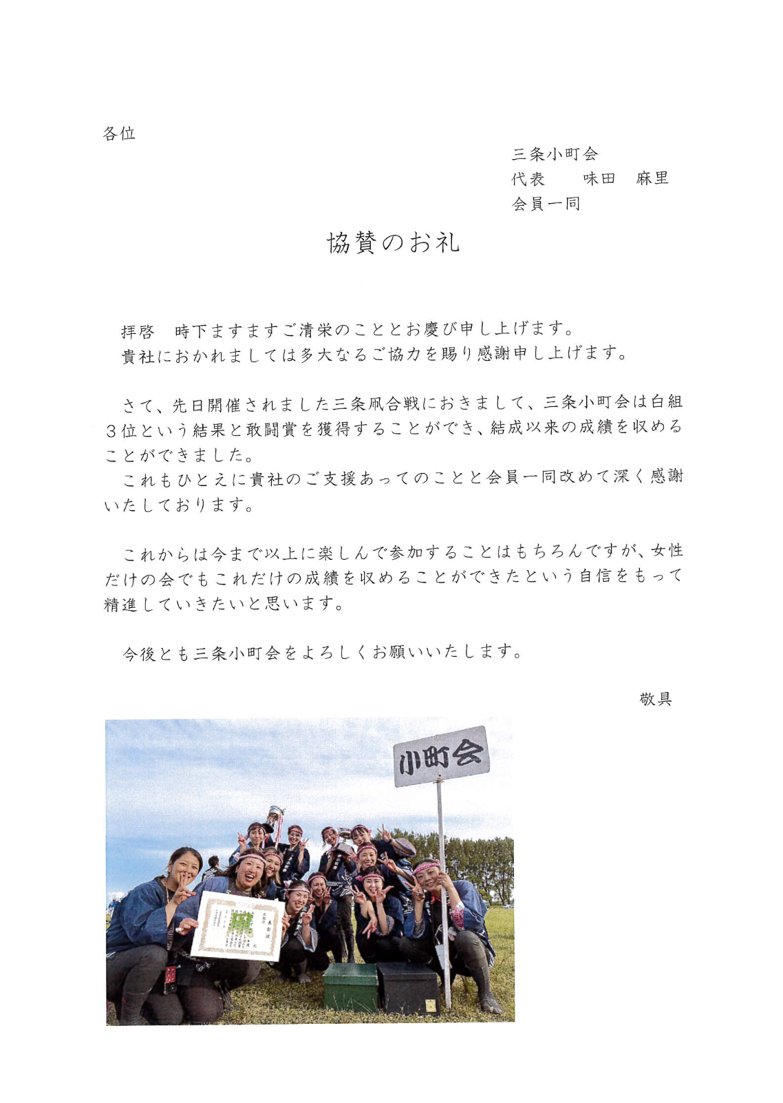 去る6月3日(土)、翌4日(日)に、三条防災ステーションにおいて三条凧合戦が開催されました。当組合では凧を小町会に協賛いたしました。小町会の見事な凧揚げにより、白組3位入賞と敢闘賞を受賞されました、当組合あてにお礼のお手紙をいただきましたのでご紹介いたします。