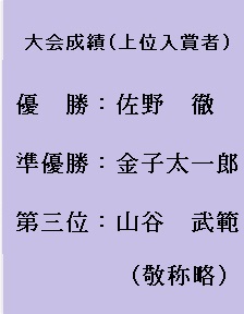 しばらくの歓談のあと、順位の発表・表彰が行われました。前半は、ブービーメーカー、13~8位、6~4位の発表でした。